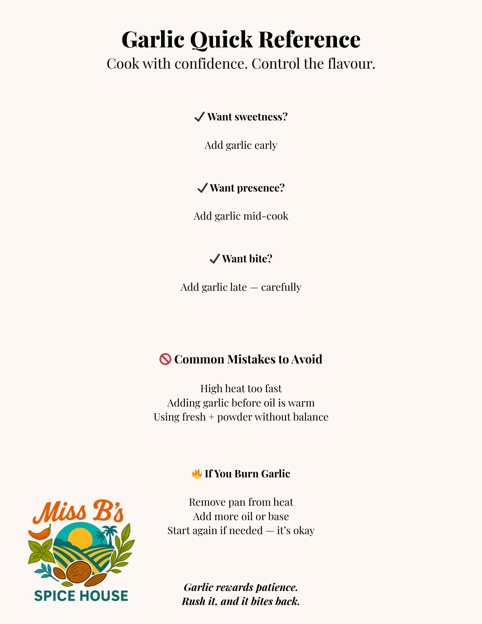 This focused 4-page guide teaches you how to use garlic intentionally — so it becomes fragrant, balanced, and flavour-building instead of sharp or overpowering.